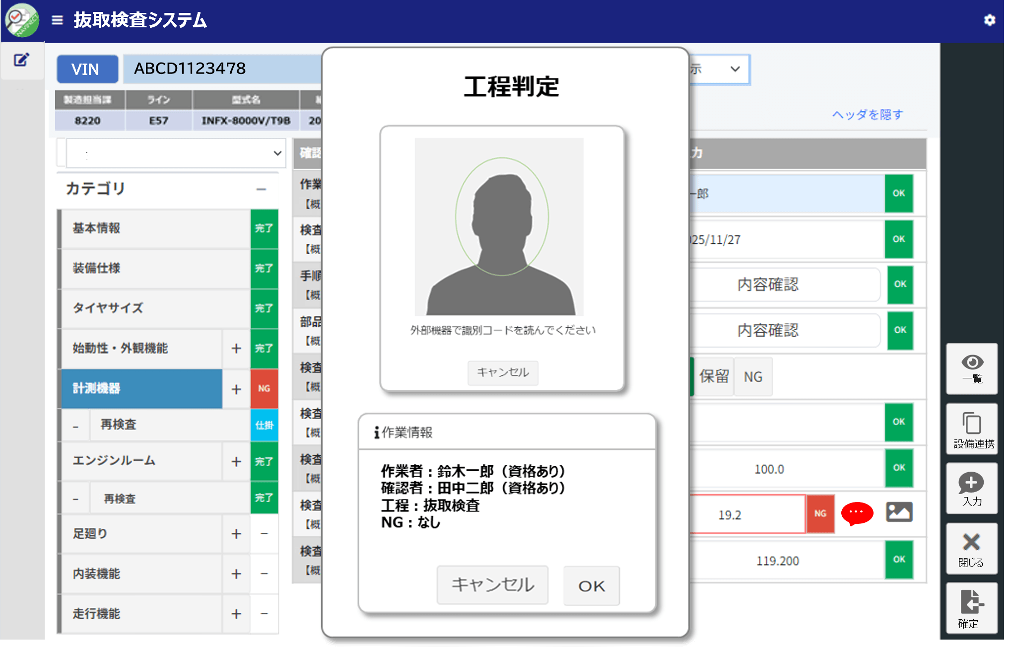 2.作業者認証設定 作業開始時に生体認証で本人確認。検査対象のQRコードを読み取り、最適な検査項目を自動展開します。