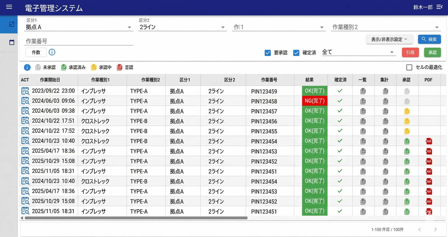 検査実績や規格等の変更を、定義されたフローに基づき承認。承認後は全数・抜取記録を統合した改ざん不可なPDF帳票を自動生成します。NAVINECTベースの厳格なワークフローにより、実績の正当性を保証し、強固なガバナンスを実現します。