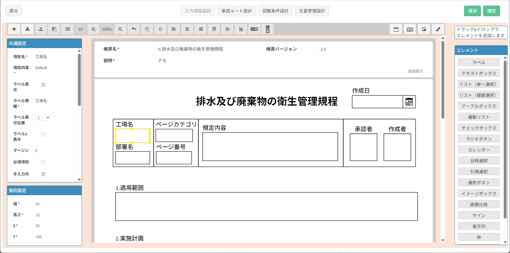 管理規定等のマネジメント文書フォーマットを自由に設計することが可能です。是正などによる急な帳票や手順書の追加・変更にも即応できるため、柔軟な現場運用を構築を支援します。