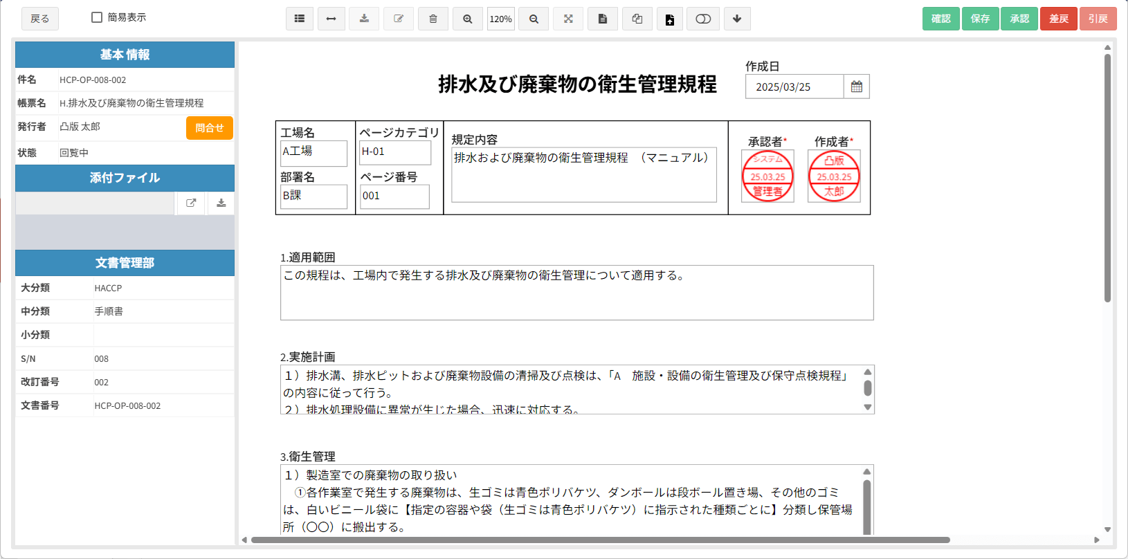 1. 管理規定策定・文書管理 HACCPの運用に必要な文書(衛生管理やモニタリング、記録保存、異常時の対応などのルール)を一元管理します。