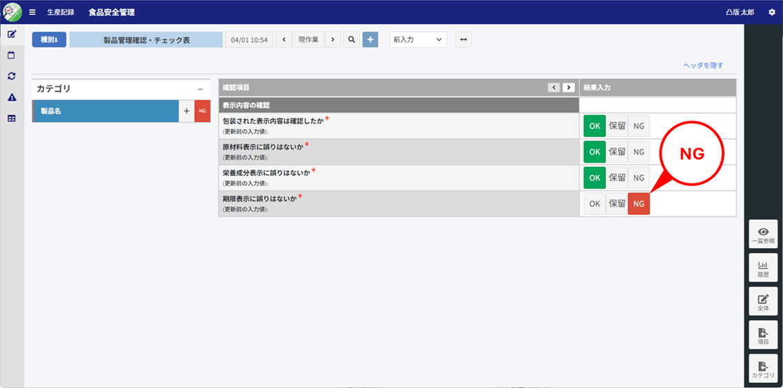 3. 衛生管理記録 作業記録と共に、清掃や消毒、健康チェックなどの実施内容や点検結果を記録することが可能です。